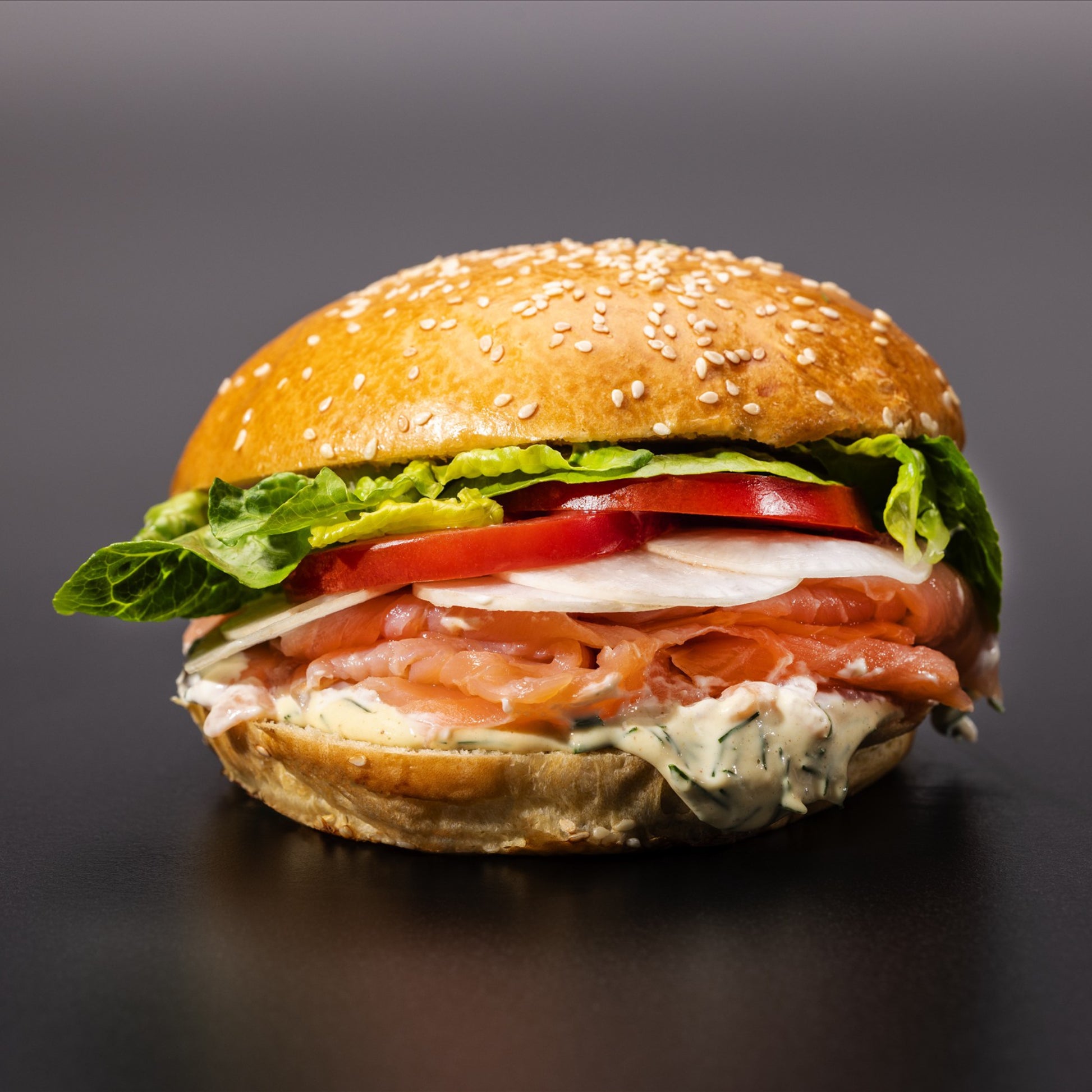 fein gebeizter Graved Lachs auf knackigen Radieschen, zarten Salatherzen und einer Dill-Schnittlauch-Mayonnaise – begleitet von einem Klecks Crème fraîche. Frisch und elegant.