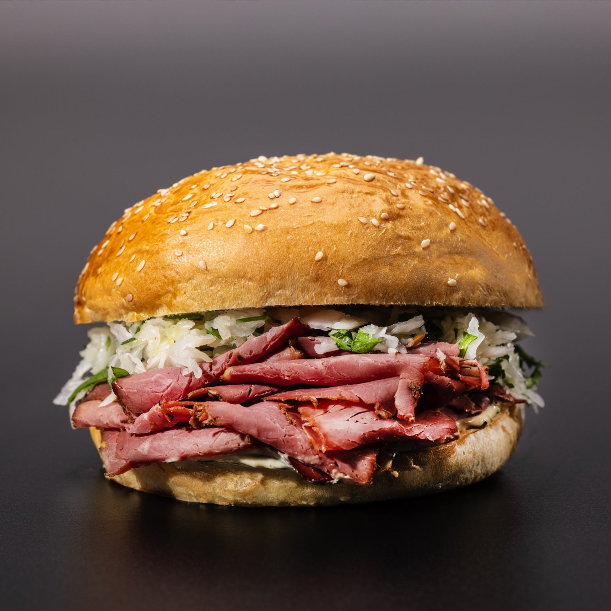 zartes Pastrami trifft auf knackigen Spitzkohl, würzige Gewürzgurken und eine cremige Senf-Dill-Mayonnaise – ein herzhafter Klassiker neu interpretiert im Bun.