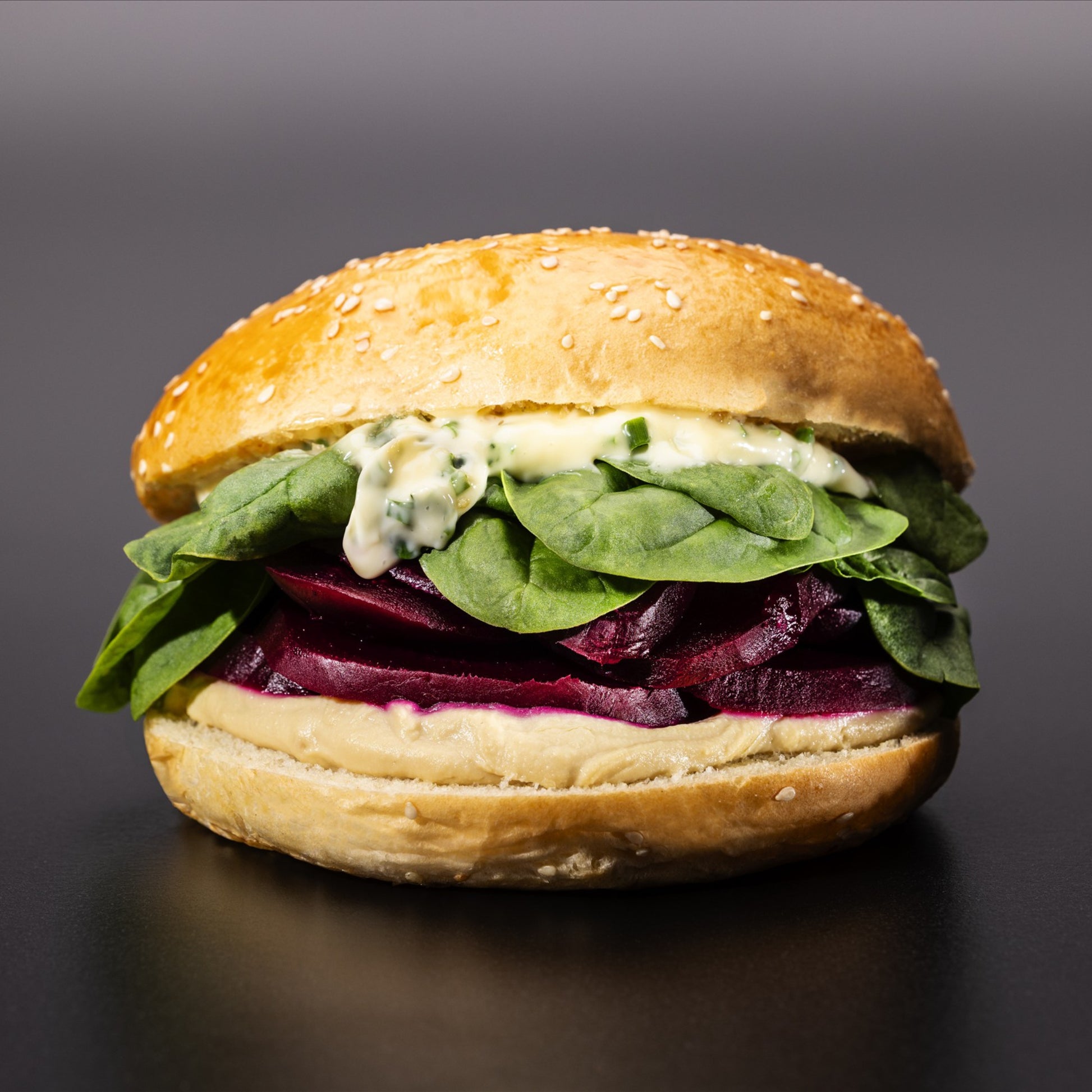 geröstete Kichererbse und cremiger Hummus, kombiniert mit erdiger Roter Bete und Koriander-Limetten-Mayonnaise – auf Babyspinat gebettet. Ein vegetarisches Highlight.