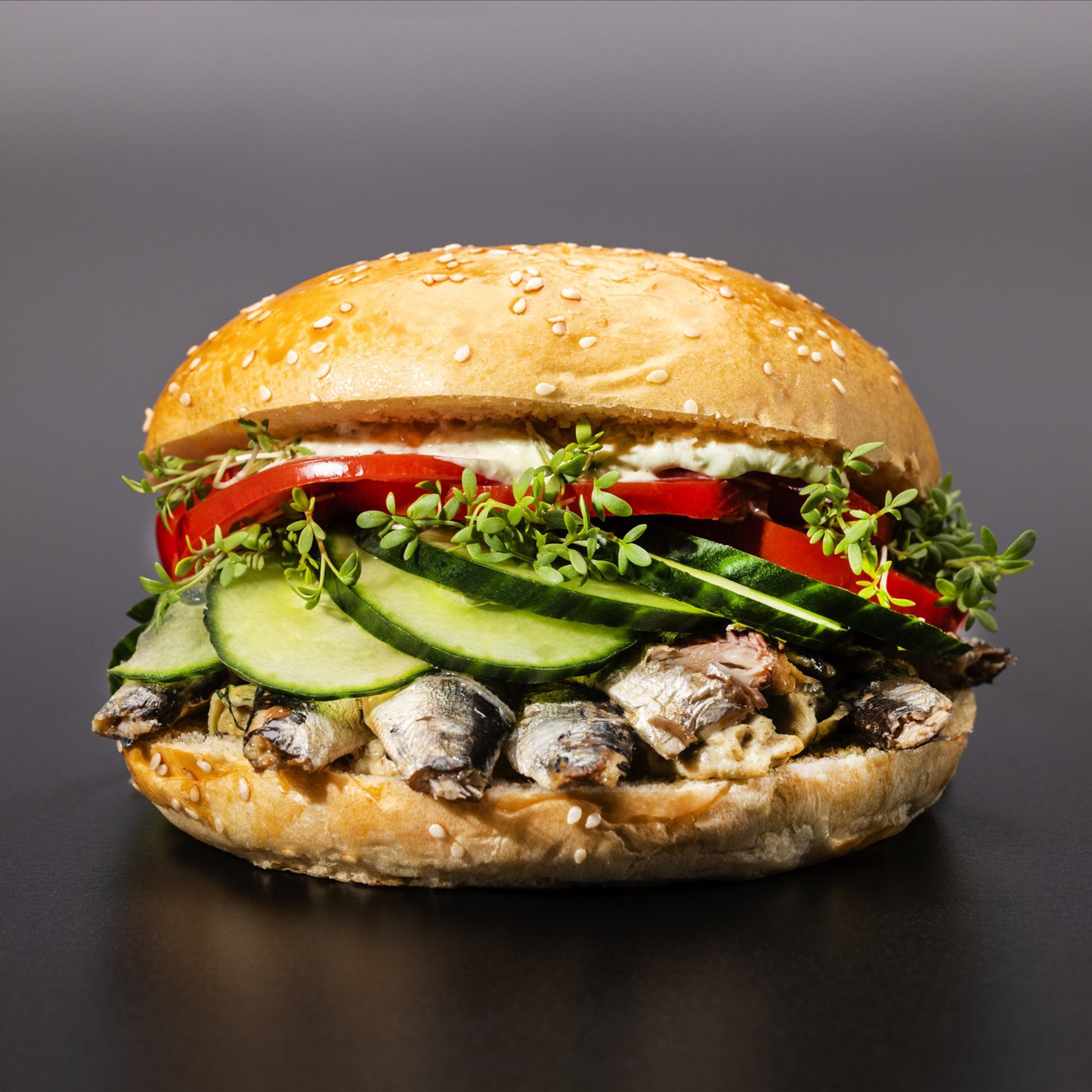 aromatische Sardinen auf cremiger Artischockencreme, mit salzzitroniger Frische, Gurke und feiner Estragon-Mayonnaise – mediterrane Raffinesse im Bun.