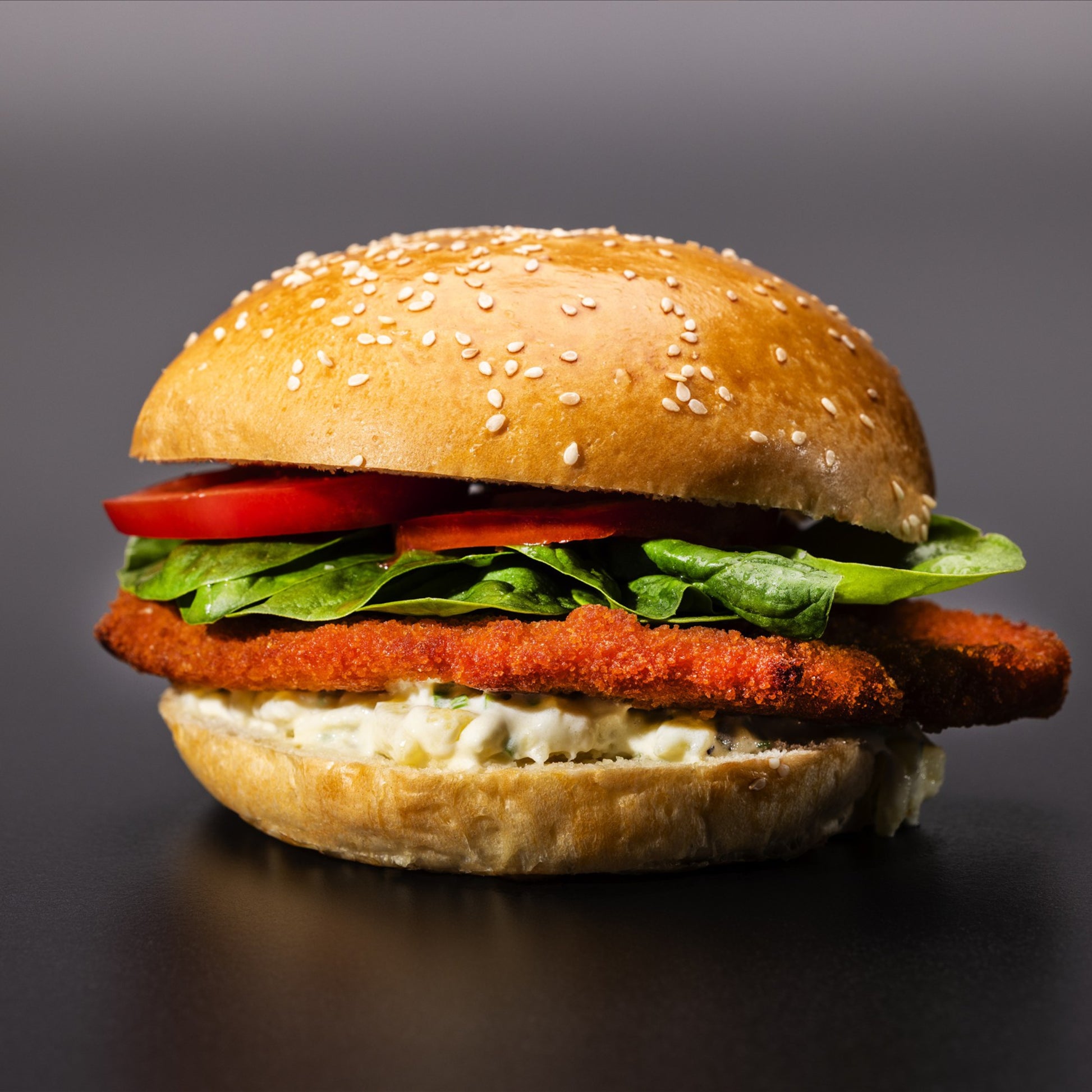 knuspriges Schweineschnitzel trifft auf cremige Kartoffel-Mayonnaise, saure Gurken, fruchtige Tomate und frischen Babyspinat – deftig, frisch, unwiderstehlich.